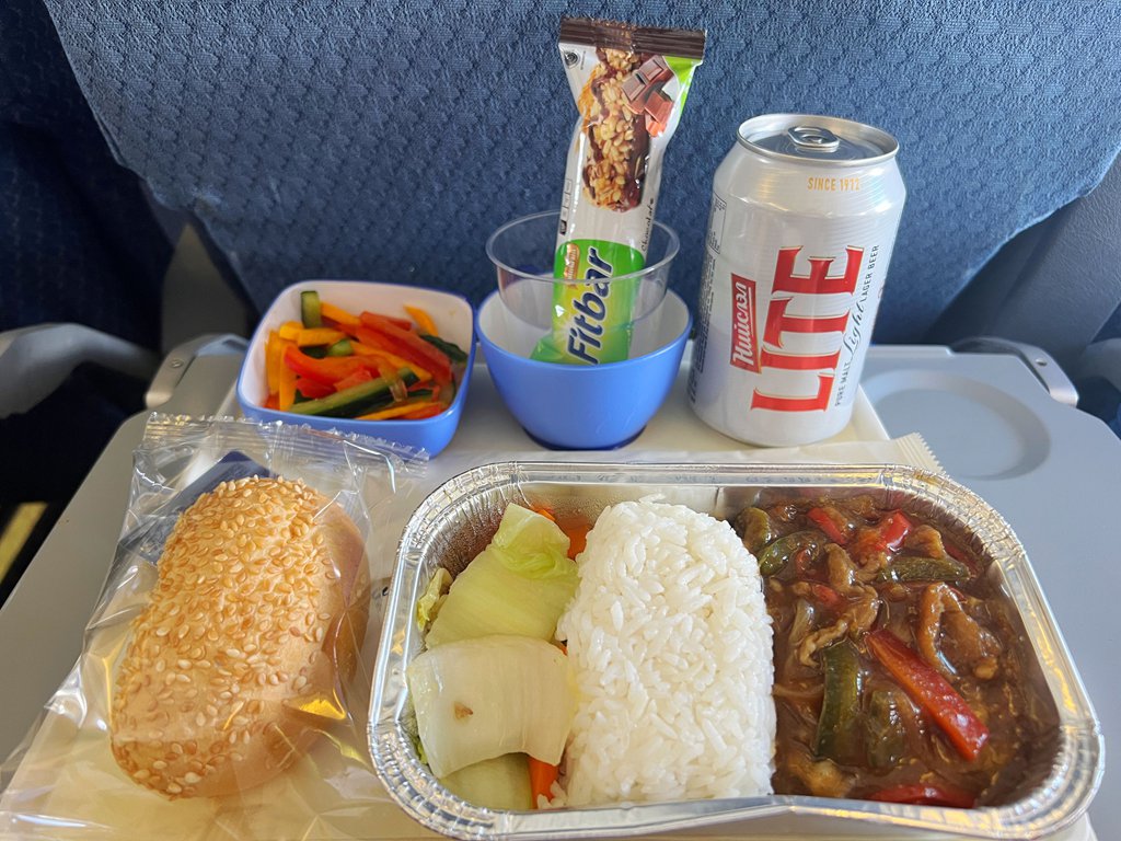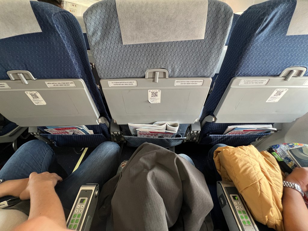 由於臺灣去蒙古國沒有直飛班機,我們是經香港飛往蒙古的新烏蘭巴托國際機場(UBN),從香港去蒙古航程約3小時43分鐘。這次坐的是經濟艙,空間如圖所示,機上會供一次點心(這趟是松子&瓶裝水),還有一個正餐。