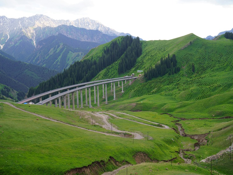 果子溝大橋位於伊犁哈薩克自治州,橫跨果子溝峽谷,是連接烏魯木齊與伊寧的重要交通樞紐。大橋全長約700米,主跨為鋼桁梁斜拉橋,設計融合了高原與峽谷地形特點。橋梁氣勢恢宏,沿途風景秀美,四季景色變化萬千,被譽為「新疆最美大橋」。